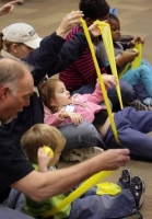 Taking Sensory Storytime from a vague idea to a relevant and functional program took months of planning and partnership. Judy McCarter, occupational therapist and consultant on sensory integration, was an essential resource in the formation of the TCCL Sensory Programming Planning Committee. This group of nine children and teen library associates came together to create, learn, and share. The committee’s first task was to assess the need for local sensory programming. They designed a survey which was distributed to library users and through The Autism Center of Tulsa and The Little Lighthouse. Of the respondents, 54 percent had never attended a library storytime and several responded with very specific examples of activities, resources, and even room set up for sensory programming (eliminate extra chairs, posters and distractions; dim lighting). Responses from the survey were used to design a structure for sensory programming. The committee researched sensory programming at public libraries and considered local customization. They spoke with professional educators, therapists, and parents, and toured some local sensory settings. The Autism Center of Tulsa participated in planning, research, and promotion throughout the development period. The committee created a Sensory Storytime pilot and developed program tools: resource lists, how-to guides, sample schedules and a template for visual guides to individual libraries. A kit of resources for Sensory Storytime was established with therapeutic seating, a visual schedule, fidgets, therabands and other supplies. In March 2012, Sensory Storytime opened for registration. Sessions were designed for 12 children, ages 1 to 7, accompanied by caregivers. Registration was online, and parents and children were given access to a visual guide to the hosting library to prepare them for storytime.