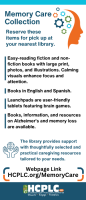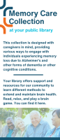 The Memory Care Collection includes 168 fiction and nonfiction items carefully chosen to meet the needs of adults experiencing memory loss, caregivers, and anyone wanting to keep their minds sharp. The collection features popular materials that offer enjoyable and accessible reading experiences. One standout component is the collection of Launchpads preloaded with apps and games like Brain Boost! and Stay Sharp! designed to improve attention span, problem-solving, and memory retention. These are the most frequently circulated items in the collection. Caregiver-focused materials also perform well and provide emotional support and practical advice. Items are available in both English and Spanish, shelved together under a purple Alzheimer’s awareness label, and managed as part of standard collection development.