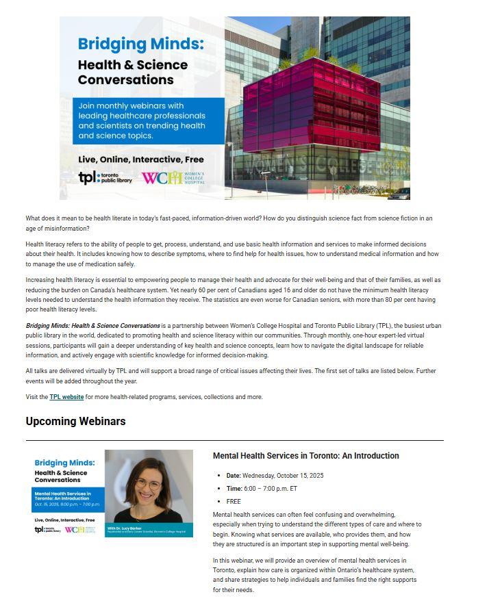 Toronto Public Library works alongside key partners such as Toronto Public Health (TPH), University Health Network (UHN) and Women’s College Hospital (WCH) to provide a range of health and wellness supports for the public, including curated collections, trusted programs and services aimed at supporting misinformation and access to health information for all ages and stages of life. These programs and services are delivered collaboratively in TPL branches and offsite at community locations such as low-income seniors’ apartment buildings and other naturally occurring retirement communities (NORCs).