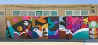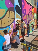 Staff applied for funding from the California Center for the Book and then secured the artist for the project. The community of Bay Point was chosen because of its lack of public art and its similarity to the demographic featured in Maybe Something Beautiful. At the event, hundreds of participants painted alongside the muralist and enjoyed stories, music, dance and crafts at a day-long festival. Children left with an autographed copy of Maybe Something Beautiful.