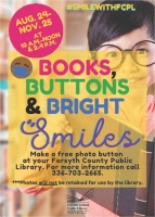 Come into any FCPL Branch and show us your smiling face. As part of "Books, Buttons and Bright Smiles," the library will take your picture and mail you a button within seven to 10 working days. You can wear your button in the library or anywhere else you go. It's our way of making the community look a little friendlier.