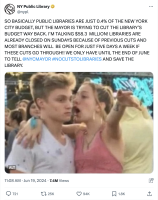 In addition to tactics we’ve deployed in past budget advocacy efforts— robust email campaign, participation in branches, elected official engagement, and media placements—an innovative approach to social media spread our message to a national audience, engaged high-profile supporters like Alexandria Ocasio-Cortez, Levar Burton, and Sarah Jessica Parker, and tapped into the public’s deep love of libraries. We took popular meme formats and gave them a public library twist, which delighted and energized our followers. Several memes went viral, with one notching more than 7M views. Our hashtag, #NoCutsToLibraries, trended nationally and locally on our June Day of Action, with 5.9K posts and 21.3K engagements as library lovers across the internet amplified our message. At the same time, with the backing of a donor from NYPL’s Board of Trustees, we ran a one-day multilingual ad campaign in 5 NYC papers on the Day of Action that asked New Yorkers to write to their elected officials.