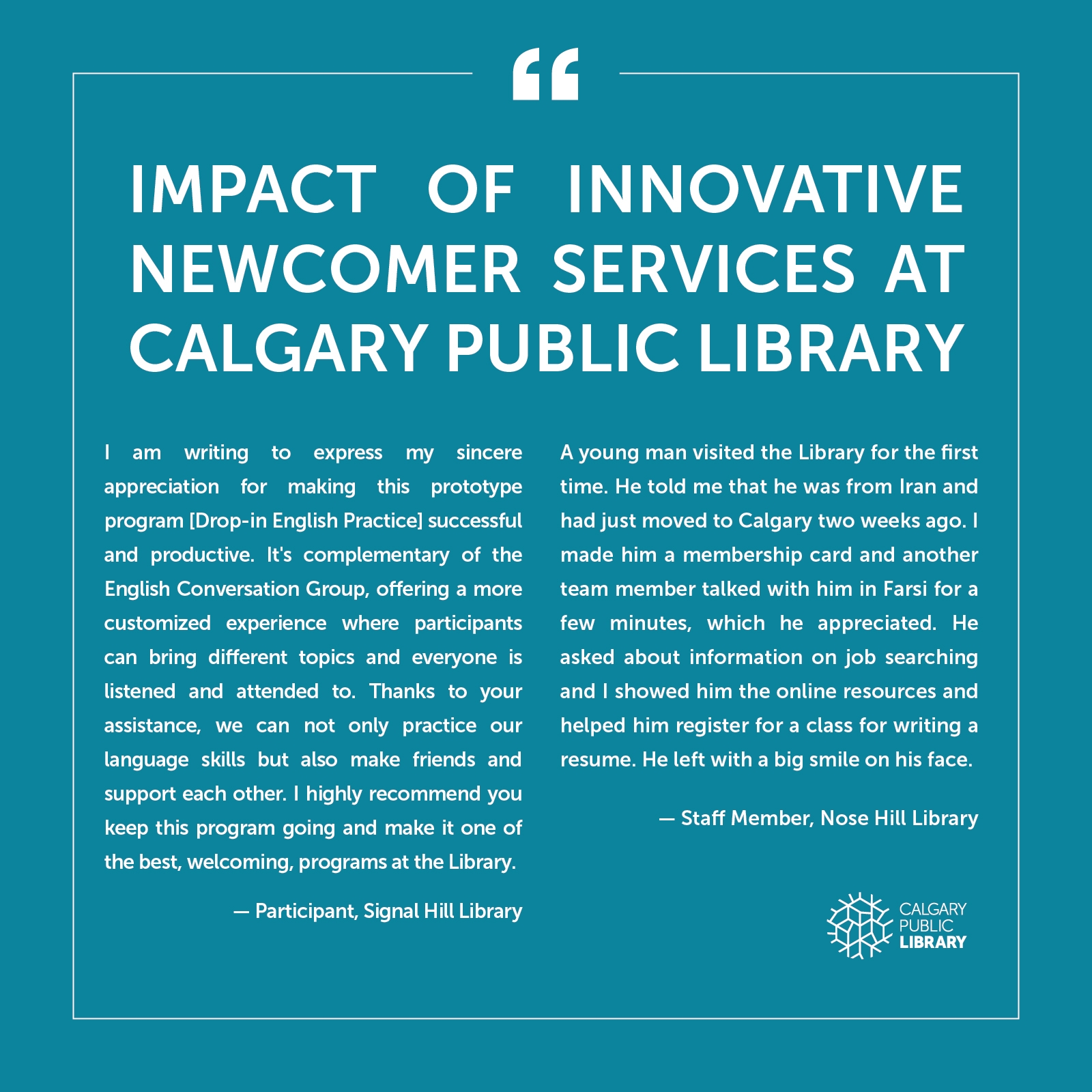 The Library works closely with and continues to evolve Newcomer Services with support of partners including Calgary Catholic Immigration Society, La Cité des Rocheuses, Calgary Local Immigrant Partnership, and Calgary Immigrant Women's Association.