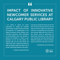 The Library works closely with and continues to evolve Newcomer Services with support of partners including Calgary Catholic Immigration Society, La Cité des Rocheuses, Calgary Local Immigrant Partnership, and Calgary Immigrant Women's Association.