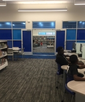A separate entrance with a gated, covered walkway securely connects the 4,200-square-foot media center portion of the new library to the elementary school. A storefront system with three doors covered in opaque window film serves to physically and visually separate the interior spaces, but can be opened after school hours to allow public access throughout. The continuous design of the carpet and matching finishes on shelving, furniture and windows blend the media center into the public library as a cohesive space.