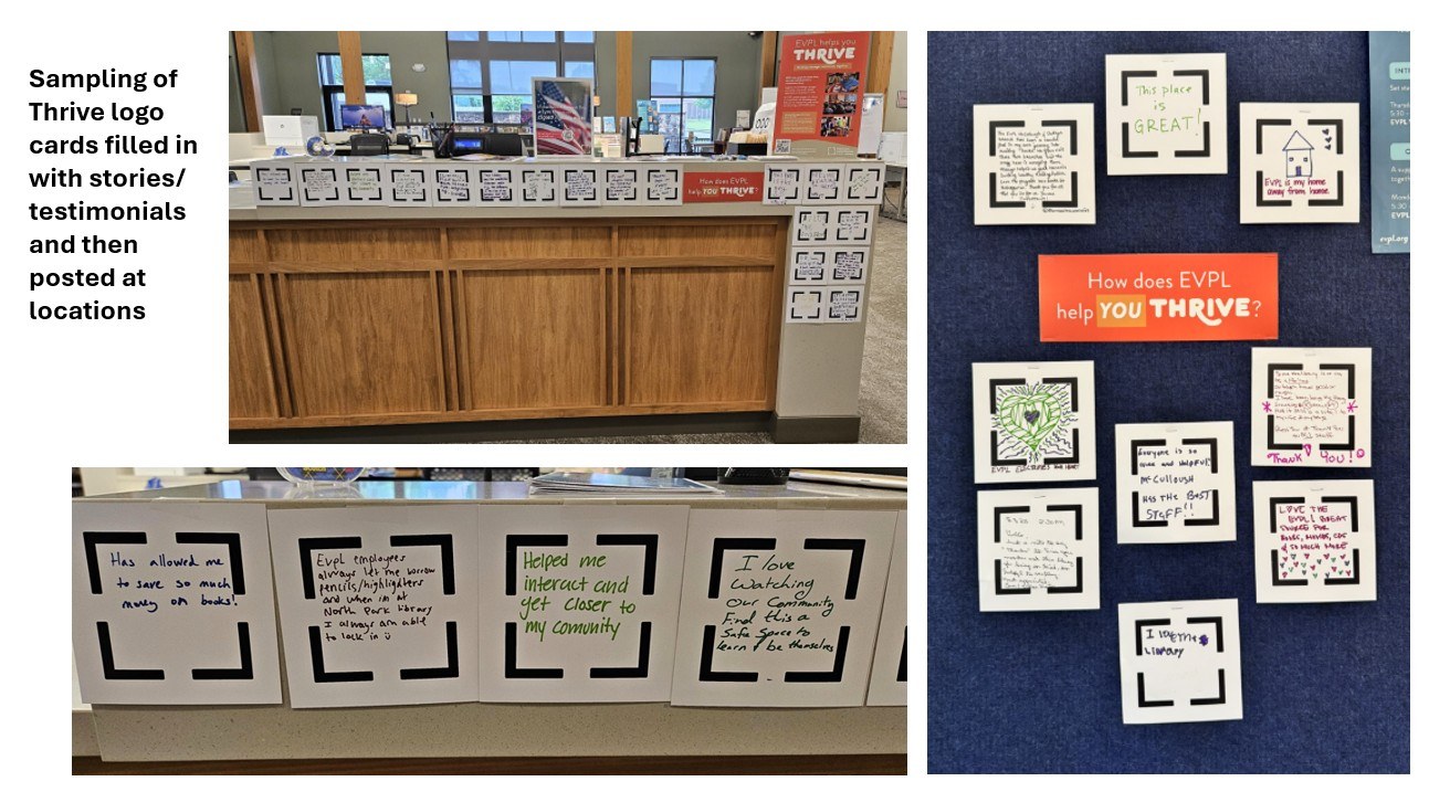 By asking people how EVPL helps *them* Thrive, and then visibly sharing those responses, we create top-of-mind awareness of the impact of the library to our community. The statement “EVPL Helps You Thrive” also prompts those who see the message to consider how EVPL helps them and/or their family Thrive, how that might be true for the others, and encourages reflection on how they might make the most of this community resource.