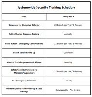 San Jose Public Library (SJPL) invested in the development of a hybrid security operation consisting of a team of in-house Senior Security Officers, supplemented with contract security to support all 24 branch locations city-wide in incident reporting and response. Library Senior Security Officers carry out critical roles of de-escalation, incident reporting, coordination with emergency personnel (Fire, EMT, Police, etc.), resource referral to county services for those experiencing homelessness or mental health crisis, and rendering First Aid/ CPR. Library Senior Security Officers are also instrumental in system-wide safety & security training for staff. To ensure quality assurance and consistent incident response, reporting, and escalation, SJPL has instituted an extensive training/onboarding program for in-house Security Officers, mandatory training and on-boarding protocols for contract security personnel, and system-wide staff training and empowerment in incident response.