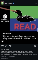 An unexpected opportunity to sign more residents up for library cards arose in late 2023 when it was announced that the Minnesota state flag was set to be redesigned. As part of the process, the state sought design submissions from the public. More than 2,000 flag designs were submitted by community members including several with loons shooting lasers out of their eyes. Although none of the wackier designs made it to the final flag, the “laser loon” quickly became a state-wide favorite. In early 2024, public discourse showed no signs of slowing. Drawing inspiration from other library systems, SPPL decided to "give the people what they wanted” by creating a limited-edition library card and cover-all sticker featuring a laser loon with the call to action “READ” in an effort to invite people to sign up for a library card and encourage more people to visit library locations.