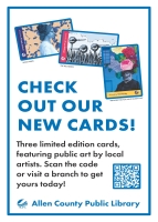 The Allen County Public Library (ACPL) launched three new, limited edition library cards available to Allen County residents featuring local art. The partnership celebrated Allen County’s thriving public art scene and the artists who make the community a vibrant place to call home. The cards featured three different artists’ work, including Theoplis Smith’s depiction of civil rights icon Rosa Parks, Bryan Ballinger’s mural “The Blue Birds,” and Tim Parsley’s homage to poet Walt Whitman's “Arouse, for you must justify me!” A team of ACPL staff chose the pieces to reflect the diversity of materials, services, and thoughts the ACPL aims to represent. Patrons were invited to choose their preferred design in person at any ACPL location or by applying online, while supplies lasted.