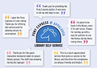 The Pony Express @ Appaloosa Library opened on March 15, 2021 as a self-serve model allowing specially registered patrons to enter the facility with their library cards to independently browse and check out items, access public computers, use free Wi-Fi, fax and printing services and utilize study rooms during specified hours without staff monitoring.