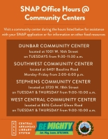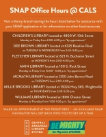 SNAP navigators hold office hours offering patrons assistance with their SNAP applications as well as guidance on other food assistance programs in the area. Office hours are currently held at seven branch locations. The program was started over the Summer of 2021, when our AmeriCorps volunteers helped design and launch it.