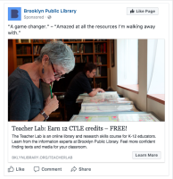 The Teacher Lab online course, launched in July 2017, is Brooklyn Public Library’s effort to connect library resources with as many teachers as possible. The free, self-paced course introduces fundamental library, research and information literacy skills while helping K-12 educators find a richer variety of resources for their classrooms.