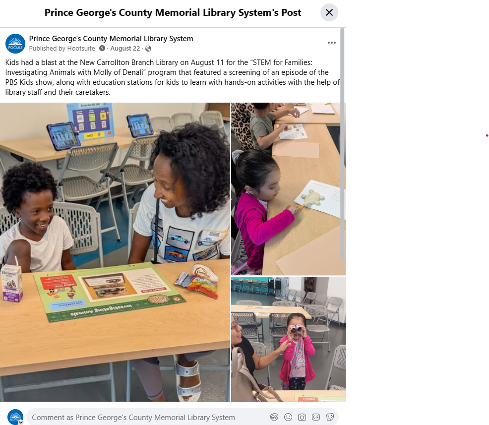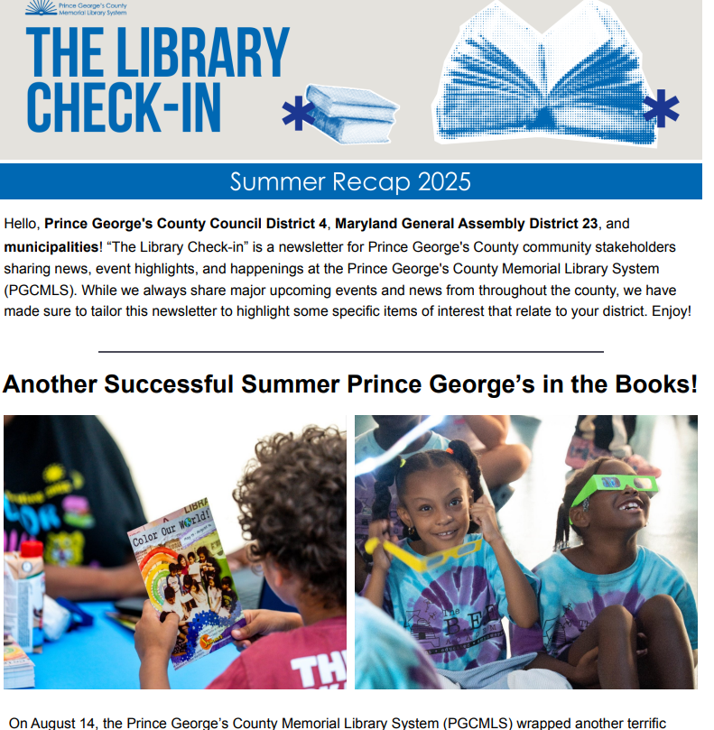 “The Library Check-In” is a targeted communication initiative that incorporates 16 custom recap newsletters to key audiences, released quarterly, that share notable stories from across the entire library system, including staff achievements, system developments, and notable, community-oriented programs at each of the Library’s 20 locations (19 branches, plus a correctional center law library). The PGCMLS Communications Department has successfully worked system-wide with branch staff, administrative staff, and the executive suite, to carefully curate District-specific newsletters that tell the Library’s most important stories.