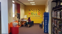 The Low Vision Reading Room is an innovative approach to creating welcoming and accessible libraries. Thanks to a donation from the Semmes Family Foundation, the space was created in an empty reading nook. In addition to the physical enhancement of the space, the donation allowed the Library to expand the braille collection by over 100 titles, and to purchase assistive equipment like braille readers and magnifying desktops. The room is also home to a temporary display of unique works of art from The Color of Blind, an interactive multi-sensory art show designed for the blind and low vision community.