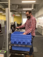Every day staff are lifting, carrying, and sliding bins. Then they are reaching, bending and twisting to remove items from the bins. The problem to solve was “how can we eliminate or reduce the amount of lifting, bending, reaching, and/or carrying of bins?” We needed something that could grab the bins so that we weren’t physically loading them onto a lift; could safely carry six bin stacks both in height and weight requirements; could adjust up and down to the exact height of the staff member working from the bin; and is easy to maneuver.